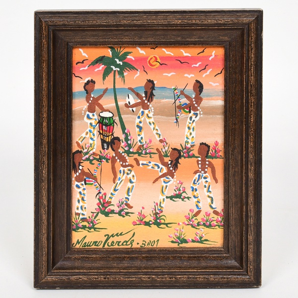 • MAURO VERDE, um (1) quadro iconográfico retratando Roda de capoeira, OST, assinado, localizado BA e datado 01 no CIE, medindo com moldura em madeira 13 x 16 cm, vide foto.