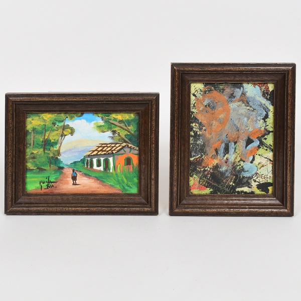 • QUADROS, dois (2) distintos, ambos OST: 1 representando pintura abstrata, assinado e datado DIEGO 2001 no CID, medindo com moldura em madeira 13 x 16 cm; 1 representando paisagem com figura e casebre, assinado e localizado GUITA  BA no CIE, medindo com moldura em madeira 16 x 13 cm, vide foto.