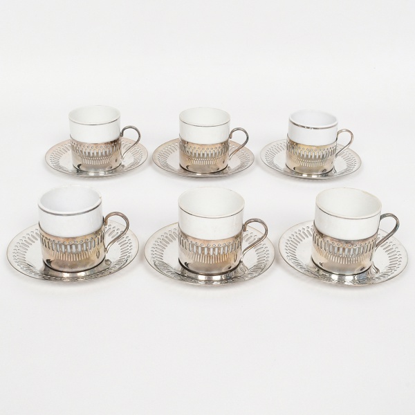 • PORCELANA E METAL PRATEADO, seis (6) xícaras para café, cilíndricas, tonalidade branca, arremates com frisos prateados, sem marca de manufatura aparente, monture e pires das marcas CRISTOFOLI e WOLFF, todas com sinais de uso, vide foto.