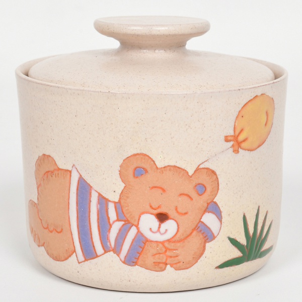 • CERÂMICA, um (1) açucareiro com tampa, esmaltação vítrea policromada representando urso dormindo, medindo 10,5 cm altura e 11 cm diâmetro, vide foto.