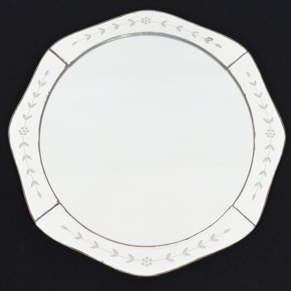 • ESPELHO, um (1) oval, padrão veneziano, borda com singela ornamentação vegetalista, medindo 41,5 x 36,5 cm, sinais de uso, vide foto.