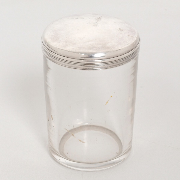 • VIDRO E METAL PRATEADO, um (1) antigo pote cilíndrico, incolor e translúcido, tampa da marca HALPHEN (Charles Halphen, ourives parisiense ativo no século XIX, estabelecido na 4 Rue D Hauteville, Paris), lisa e canelada na horizontal da borda, medindo 10 cm altura e 7 cm diâmetro, sinais de uso, vide foto.