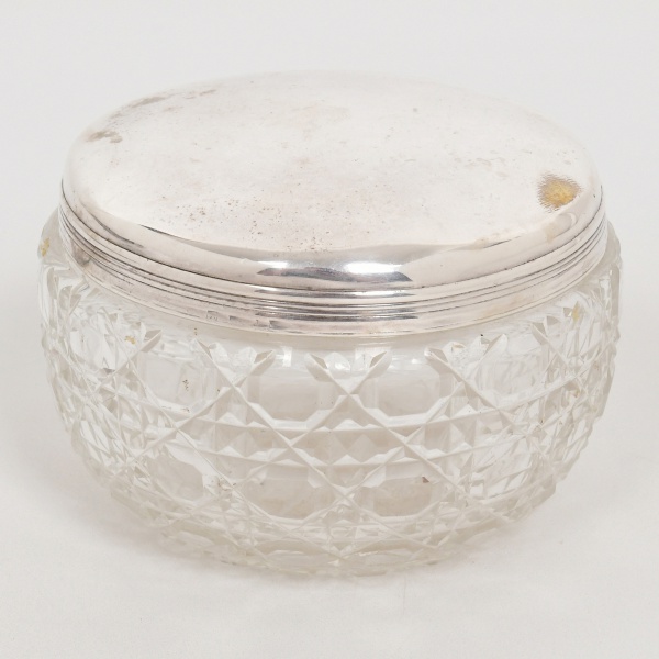 • CRISTAL E METAL PRATEADO, um (1) antigo potiche com tampa, incolor e translúcido, lapidação geometrizada, fundo estrelado, possivelmente CRISTALERIE BACCARAT (fundada em 1765 pelo Bispo de Metz na região de Baccarat como Verrerie de Saint Anne; em 1815 foi vendida, junto com outras Verreries da região, para Gabriel D'Artigues e virou Voneche-Baccarat, passando a fabricar cristal de alta qualidade; em 1822 foi vendida e virou Compagnie des Cristalleries de Baccarat, mantendo o nome Voneche até 1843, atualmente é a Cristallerie mais importante da França), tampa com borda canelada na horizontal, medindo 10 cm diâmetro e 6,5 cm altura, sinais de uso, vide foto.