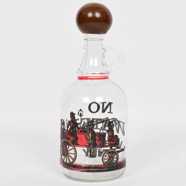 • VIDRO, uma (1) garrafa, incolor e translúcida, ornamentação esmaltada representando charrete, tampa rosqueável com acabamento em madeira torneada, legenda: No Water Whisky Only, medindo 27 cm altura, ideal para adornar bar, sinais de uso, vide foto.