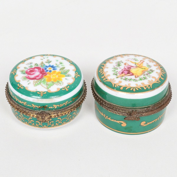 • PORCELANA, duas (2) caixas miniatura: 1 ornada com cena de galanteio; 1 ornada com flores, ambas em policromia com arremates a ouro e monture em bronze, fecho de uma delas partido, marca de manufatura na base, medindo em média 6 cm diâmetro e 4 cm altura, vide foto.