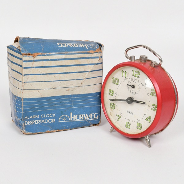 • RELÓGIO, um (1) despertador da marca HERWEG (Caixa Postal 14, Timbó, SC), tonalidade vermelha, mecanismo a corda, funcionando com segundeiro parado, demanda revisão, acondicionado na caixa original, sinais de uso, vide foto.
