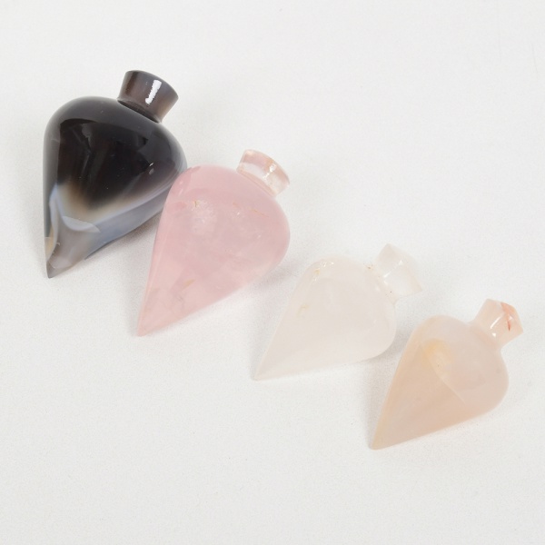 • GEMAS, quatro (4) esculturas torneadas no formato de peão, confeccionadas em ágata, quartzos rosa e branco, medindo a maior 5 cm altura, vide foto.