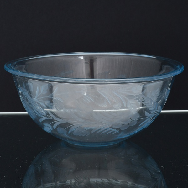 • VIDRO, uma (1) saladeira tipo bowl, incolor e translúcida, acetinada, lapidada em elementos vegetalistas, medindo 20 cm diâmetro e 9 cm altura, pouco uso, vide foto.