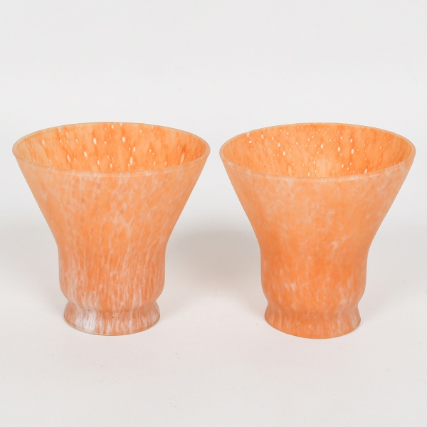 • LUMINÁRIA, par (2) cúpulas em vidro mesclado nas tonalidades laranja e branco, medindo 11 cm diâmetro e 10,5 cm altura, sinais de uso, vide foto.
