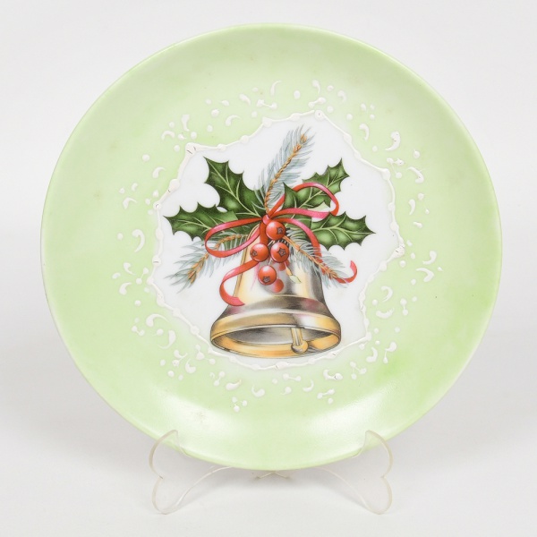 • PORCELANA, um (1) prato decorativo com ornamentação natalina representando sino, pintado a mão pelo atelier Lena Abrantes 98, medindo 19 cm diâmetro, vide foto.