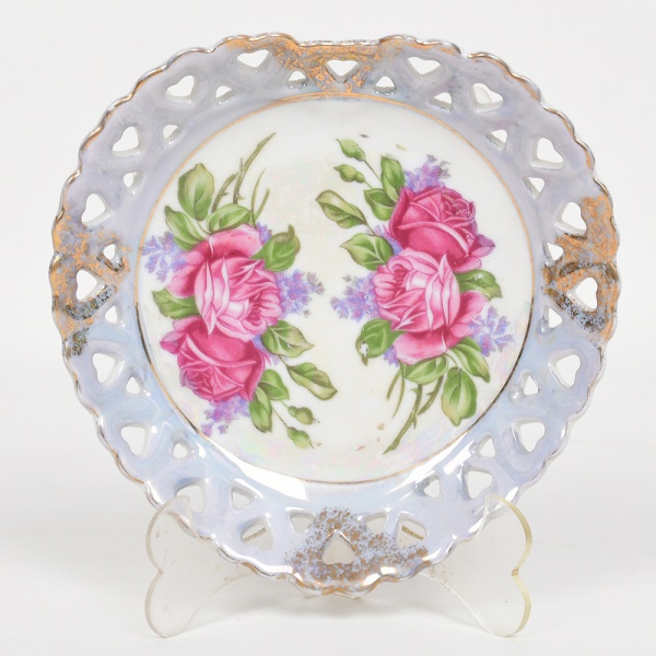 • PORCELANA, um (1) prato decorativo quase triangular, borda vazada, ornamentação floral policromada, arremates a ouro já com sinais de desgastes, medindo aproximadamente 14,5 cm diâmetro, sem marca de manufatura aparente, vide foto.