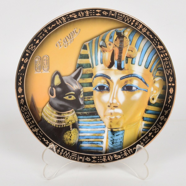• PORCELANA EGÍPCIA, um (1) prato decorativo com ornamentação policromada representando TUTANCÂMON, arremates a ouro, marca FM (Fathy Mahmoud), medindo 16 cm diâmetro, vide foto.
