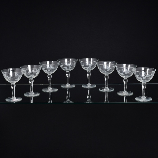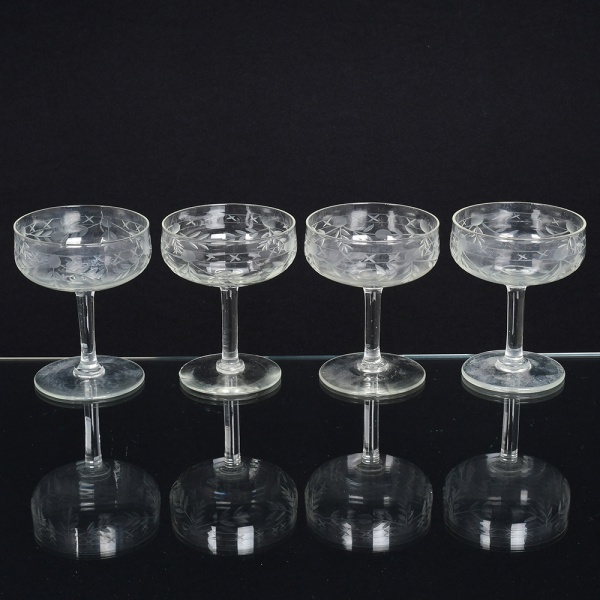 • VIDRO, quatro (4) taças de pé alto para champanhe ou espumante, incolores e translúcidas, bojo com singela lapidação vegetalista, fuste cilíndrico, base em bolacha, medindo 10 cm altura, sinais de uso, vide foto.