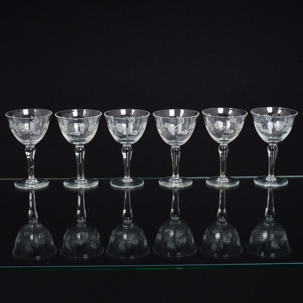 • VIDRO, sete (7) taças de pé alto para vinho do Porto, incolores e translúcidas, bojo com singela lapidação vegetalista, fuste no formato de balaustre, base em bolacha, medindo 10 cm altura, sinais de uso, vide foto.