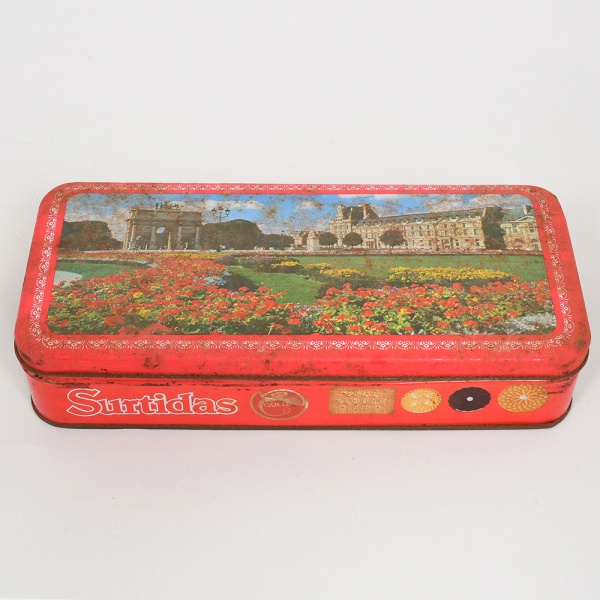 • DIVERSOS, uma (1) caixa vazia de biscoitos sortidos, marca QUETZAL, confeccionada em folha de flandres, ligeiros sinais de oxidação, marcas do uso, vide foto.