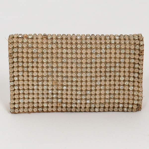 • ACESSÓRIO FEMININO, uma (1) antiga bolsa de festa, confeccionada em pelica (possivelmente), recoberta em trama de tela com prendedores em metal, apliques de inúmeras pedras de strass incolores e acetinadas (faltando algumas), alça solta em um dos lados, acompanha espelho interno dupla face, medindo 14 x 8 cm, sinais de uso, vide foto.