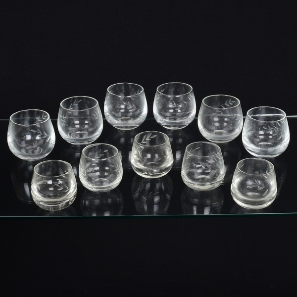 • VIDRO, onze (11) taças de pé alto para água, incolores e translúcidas, bojo com singela lapidação vegetalista, fuste no formato de balaustre, base em bolacha, medindo 14,5 cm altura, sinais de uso, vide foto.