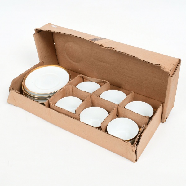 • PORCELANA, seis (6) xícaras para chá, tonalidade branca, detalhes a ouro, modelo MEDAILLON, manufatura RENNER (Porto Alegre, RS, fundada em 1942; em 1998 foi vendida para a Vista Alegre de Portugal; em 1999 mudou a razão social para Vista Alegre do Brasil), na caixa e sem uso, vide foto.