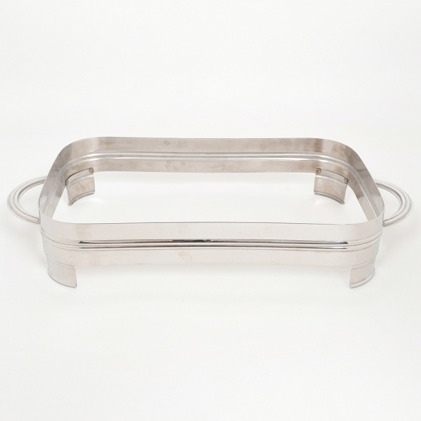 • AÇO INOX, um (1) suporte para travessa, ornado com frisos, medida interna 32,5 x 19 cm, sinais de uso, vide foto.