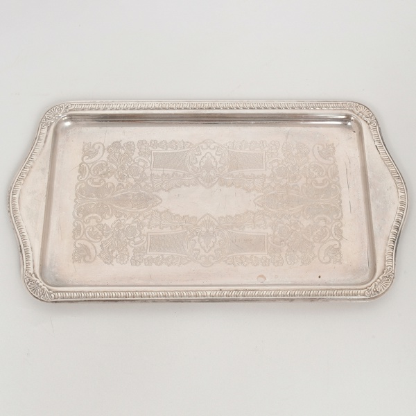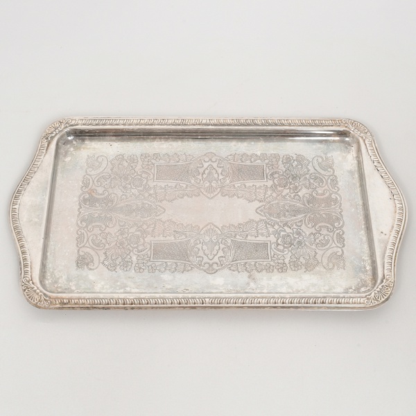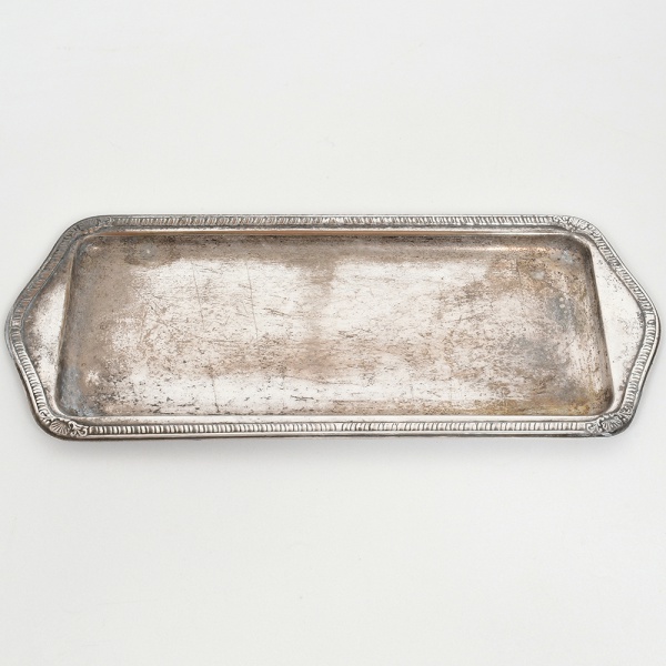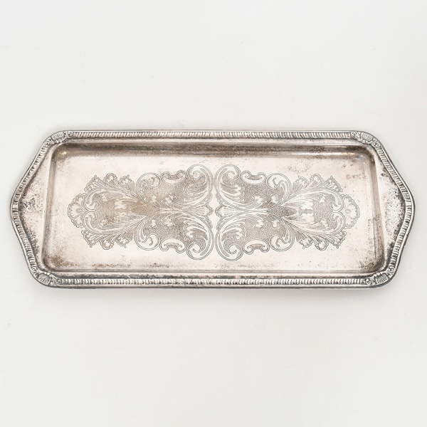 • AÇO INOX, uma (1) travessa quase retangular, fundo em baixo relevo representando volutas e elementos vegetalistas, borda relevada em corda, conchas e elementos vegetalistas, sem marca de manufatura aparente, medindo 33 x 14 cm sinais de uso, vide foto.