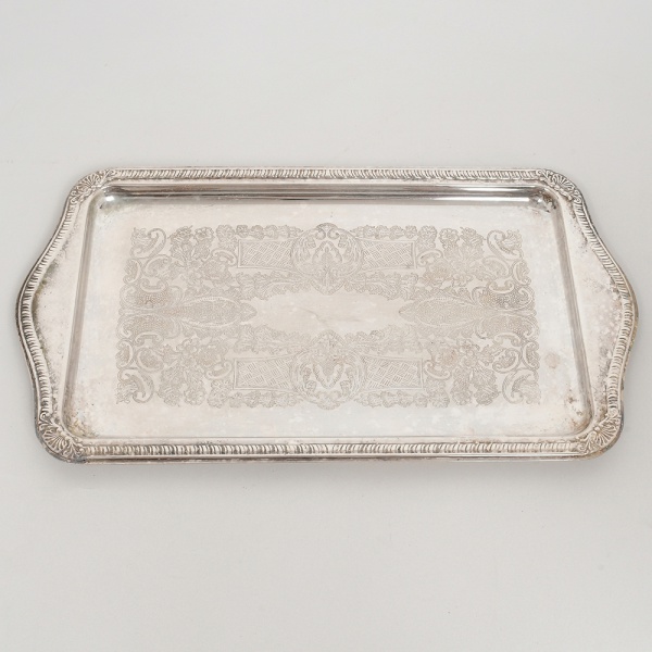 • AÇO INOX, uma (1) travessa quase retangular, fundo em baixo relevo representando pérgulas, volutas e elementos vegetalistas, borda relevada em corda, conchas e elementos vegetalistas, sem marca de manufatura aparente, medindo 36 x 20 cm sinais de uso, vide foto.