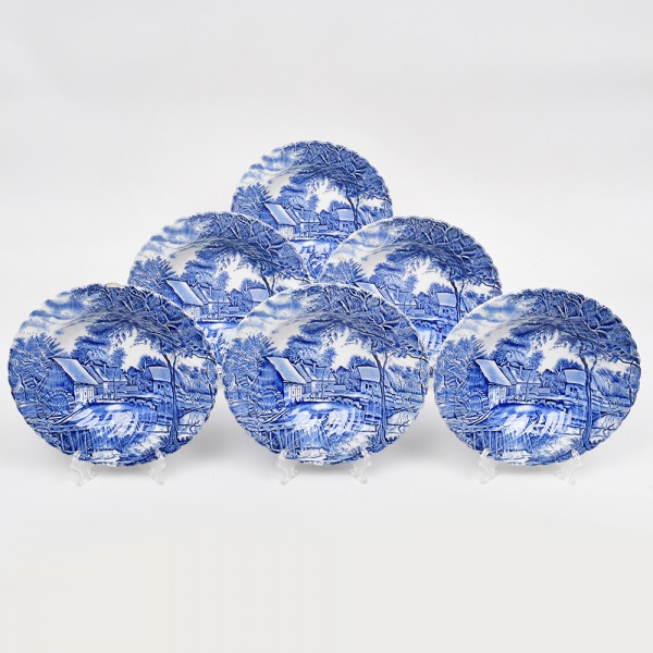 • Johnson Brothers, Staffordshire - Inglaterra(Fundada em 1883). Belíssimo conjunto de pratos fundos executado em faiança inglesa, padrão Watermill. Decoração monocromática em azul sob esmalte, representando paisagem rural com moinho hidráulico, executada por estampagem. A composição mostra edifício de moinho com roda dágua em funcionamento, pequeno dique e queda d'água, acompanhados por casas campestres, árvores frondosas, figuras humanas em ambiente bucólico e céu anuviado ao fundo; orla modelada com delicado movimento ondulado, borda recortada com arcos em repetição. Marca da manufatura no verso. Composto de seis(06) unidades. Medida: Diam.: 22,5 cm.