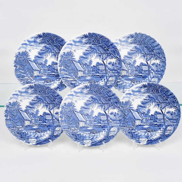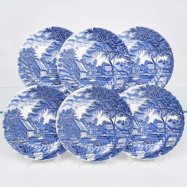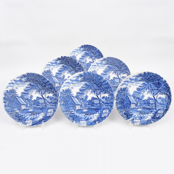 • Johnson Brothers, Staffordshire - Inglaterra(Fundada em 1883). Belíssimo conjunto de pratos rasos executado em faiança inglesa, padrão Watermill. Decoração monocromática em azul sob esmalte, representando paisagem rural com moinho hidráulico, executada por estampagem. A composição mostra edifício de moinho com roda dágua em funcionamento, pequeno dique e queda d'água, acompanhados por casas campestres, árvores frondosas, figuras humanas em ambiente bucólico e céu anuviado ao fundo; orla modelada com delicado movimento ondulado, borda recortada com arcos em repetição. Marca da manufatura no verso. Composto de seis(06) unidades. Medida: Diam.: 25 cm.