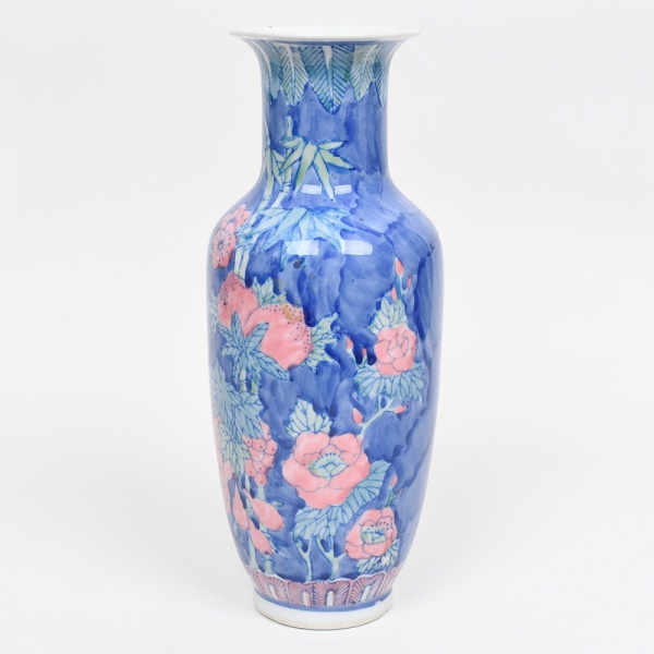 • Vaso em porcelana com esmaltação policromada sob vidrado. Corpo ovóide com ombros arredondados, pescoço cilíndrico e borda ligeiramente aberta. Decoração com fundo azul em variação tonal, apresentando motivos florais e ramos com folhas estilizadas, incluindo elementos que remetem a peônias e cachos de frutos. Faixa decorativa na base com padrão repetitivo em vermelho e azul. Interior esmaltado em branco. Provavelmente de fabricação chinesa. Medidas: Alt.: x Diam.: