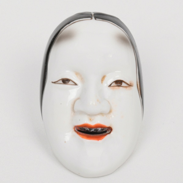 • Máscara japonesa em porcelana esmaltada (tipo Noh / Okame), moldada representando rosto feminino estilizado, de feições serenas, olhos semicerrados e boca levemente entreaberta. Cabelos indicados por esmaltação de tonalidade preta, delimitados por traço fino; lábios em tonalidade alaranjada com interior escurecido. Modelagem suave, com volumes contínuos e simplificação formal típica de máscaras teatrais japonesas.Verso fechado, com dois orifícios de suspensão na parte superior, indicando uso como elemento decorativo de parede. Produção por moldagem seriada com acabamento manual na pintura. Tipologia associada a máscaras femininas do teatro Noh ou à figura de Okame/Otafuku, comum em peças decorativas de exportação. Medidas: Alt.: 6,5 x Comp.: 4,5 x Larg.: 4 cm.
