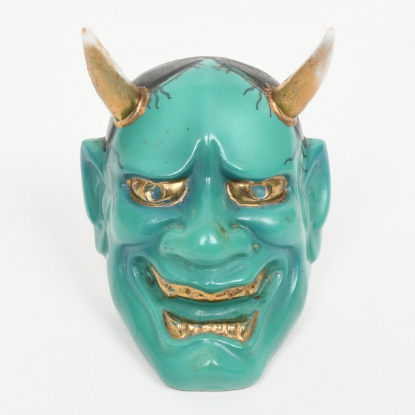 • Cabeça de Oni executada em porcelana esmaltada(okimono / ornamento). Escultura em porcelana moldada representando face de oni (demônio do folclore japonês), com expressão marcada, dentes expostos e dois chifres superiores. Modelagem volumétrica com traços acentuados, sobrancelhas arqueadas, olhos amendoados e boca entreaberta com dentes expostos. Superfície com esmaltação em verde-turquesa no rosto, áreas em negro no cabelo e detalhes realçados a douração nos olhos, dentes e base dos chifres. Verso vazado, indicando uso como peça decorativa de parede ou elemento ornamental não funcional (okimono adaptado para fixação/apoio). Medidas: Alt.: 7 x Comp.: 5 x Larg.: 4 cm. Chifres apresenetam pequena quebradura, desgastes na douradura.