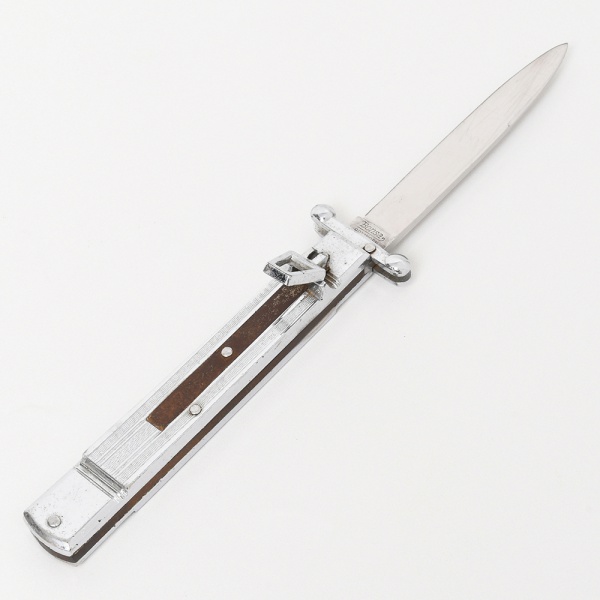 • Faca de coleção automática (tipo stiletto), lâmina confeccionada em aço com inscrição Bonsa  Solingen e marca rostfrei. Perfil estreito, de ponta aguda. Guarda transversal metálica com terminais esféricos. Cabo em metal com placas laterais e nervuras longitudinais, com botão de acionamento e mecanismo interno de mola para abertura automática. Trava lateral integrada ao conjunto. Medidas: