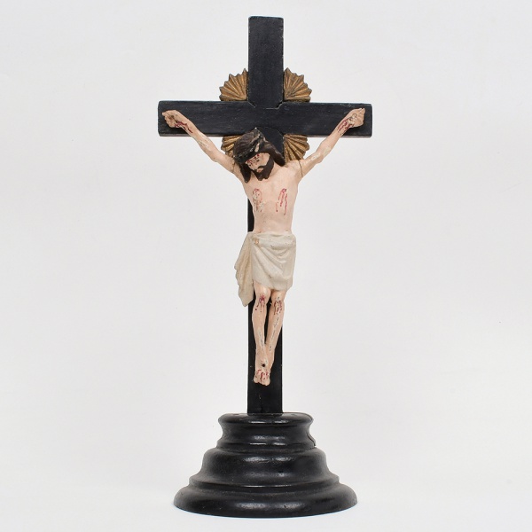 • ARTE SACRA. Cristo crucificado. Executado em madeira entalhada e policromada. Cruz latina de hastes retangulares, com acabamento em pintura monocroma escura. Figura de Cristo em vulto pleno, representada com cabeça inclinada, olhos cerrados, perizônio drapeado e marcas da Paixão indicadas por pintura. Resplendor posterior em madeira, em forma de raios estilizados, disposto junto ao cruzeiro. Conjunto fixado em base torneada de perfil escalonado. Estado conforme fotografias. Medidas: Alt.: x Comp.: