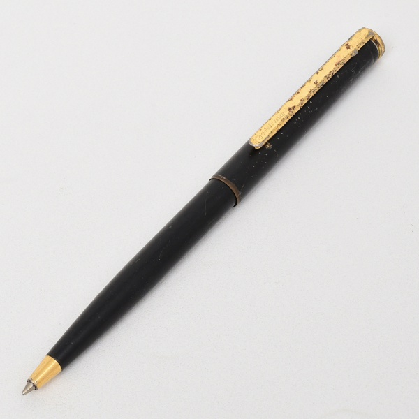 • Caneta esferográfica de coleção, corpo em resina preta e ponteira cônica em metal dourado. Tampa com clipe metálico dourado, gravado com a marca do fabricante GOLDRING, Mecanismo interno articulado que, ao abrir a tampa, aciona carimbo retrátil embutido, composto por base metálica com matriz em borracha. Estrutura interna marcada US Pat." e numeração, indicando patente do sistema. Área do carimbo com resíduos de tinta e desgaste de uso. Apresenta sinais de oxidação. Medida: