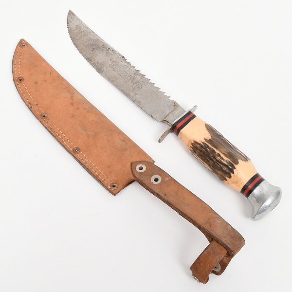 • Faca de caça com lâmina em aço, com fio principal liso e dorso parcialmente serrilhado, apresentando marca MUNDIAL gravada. Lâmina de perfil alongado com ponta aguda.Empunhadura em material sintético com aspecto de chifre, com superfície texturizada, intercalada por anéis decorativos nas cores preta e vermelha, terminando em pomo metálico. Guarda metálica reta. Acompanha bainha em couro, com costura aparente, rebites metálicos e passador para cinto, decorada com gravação em relevo. Estado de conservação conforme fotografias. Medidas: