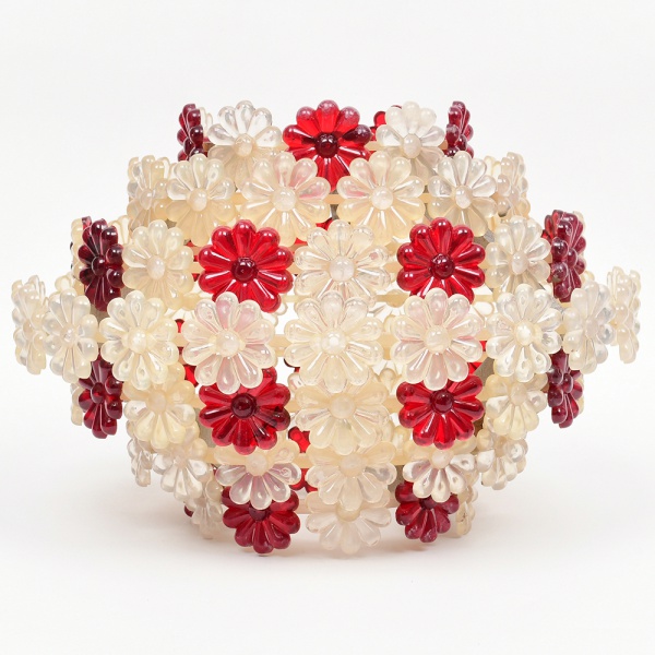 • Plafon / luminária de teto em material plástico moldado. Estrutura composta por aros concêntricos em material plástico translúcido, interligados por elementos de fixação metálicos. Superfície externa integralmente revestida por módulos florais aplicados, em plástico moldado, alternando peças translúcidas incolores e peças em tom vermelho. Composição em padrão repetitivo, formando volume esférico aberto. Elementos estruturais internos em metal, com suportes para fixação ao ponto de luz. Produção provável da década de 1960-1970. Estado conforme fotografias. Medidas: