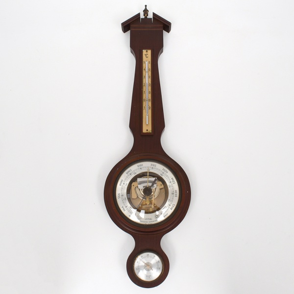 • Barômetro de parede com termômetro e higrômetro, caixa em madeira com acabamento envernizado, formato alongado com topo em frontão. Mostrador circular central com mecanismo aneroide visível, escala barométrica graduada; acima, termômetro com escala em graus Celsius; abaixo, higrômetro analógico. Elementos metálicos e mostradores protegidos por visor transparente. Medidas: