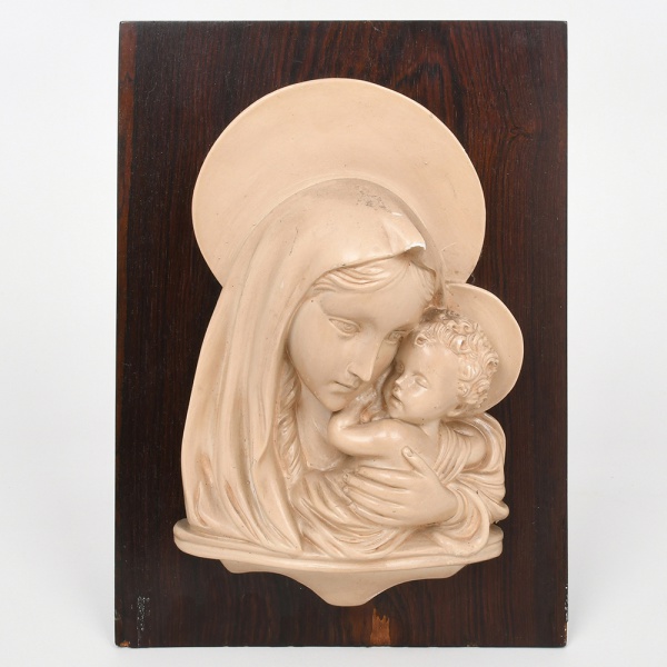 • Placa retangular em madeira, com aplicação central em resina moldada em alto-relevo, representando Virgem com o Menino Jesus, ambos com auréolas. Composição frontal, com tratamento volumétrico do grupo e base inferior integrada ao relevo. Parte posterior dotado de gancho para fixação em parede. Estado conforme fotografias. Medidas: