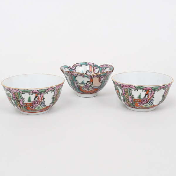 • Conjunto de três(03) tigelas em porcelana chinesa esmaltada, corpo hemisférico sobre pequeno pé anelar, com borda recortada em contorno lobado. Decoração em esmaltes policromos sobre vidrado,  e posterior realce manual, inspirada na família rosa (famille rose), apresentando reservas figurativas com personagens em ambientação arquitetônica e motivos florais estilizados, enquadrados por cercaduras ornamentais. Borda com filete dourado. Marcas apócrifas em caracteres na base. Medidas: