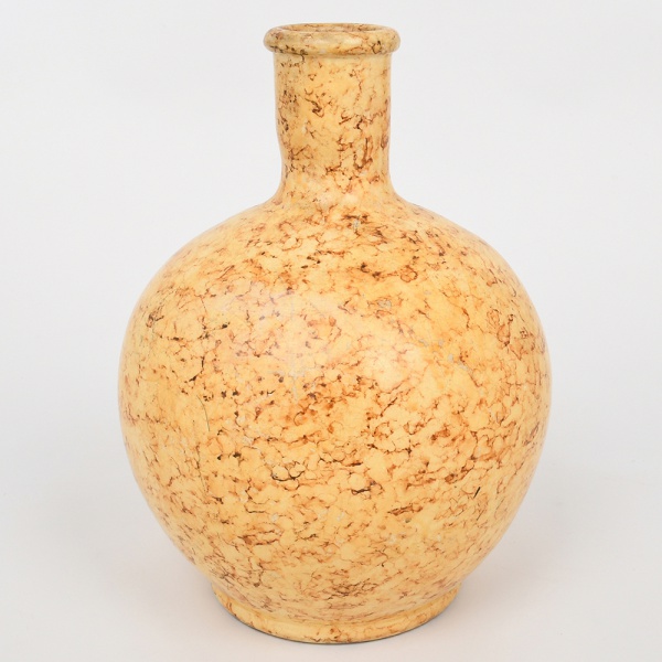 • Vaso em cerâmica, de corpo globular com ombro pronunciado, assentado sobre base anelar, com gargalo cilíndrico curto e borda levemente espessada. Superfície com decoração marmorizada em tons ocres e castanhos, simulando veios pétreos. Medidas:
