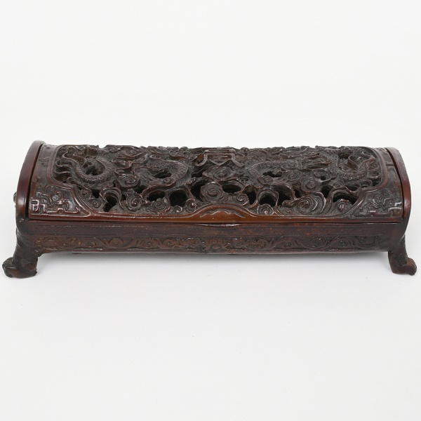 • Caixa incensário em madeira entalhada com tampa vazada. Caixa retangular alongada, apoiada sobre quatro pés zoomórficos, com tampa articulada em perfil abatido, inteiramente vazada e entalhada em alto-relevo, apresentando composição com dragões entre nuvens estilizadas e caracteres centrais. Laterais com frisos entalhados contínuos e extremidades com máscaras zoomórficas em relevo. Interior escavado. Destinada ao uso como incensário, permitindo a difusão da fumaça através da tampa vazada. Medidas: