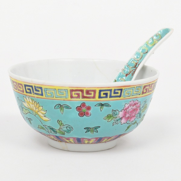 • Conjunto com tigela e colher em porcelana chinesa, corpo hemisférico sobre base anelar, acompanhada de colher de cabo alongado; decoração policromada sobre esmalte, apresentando campo externo em tom turquesa, ornamentado com reservas florais e cercadura em meandro grego junto ao bordo. Colher com decoração correlata em arabescos e flor central. Interior em branco. Base com marca em caracteres chineses em vermelho, em cartela geométrica. Medidas: