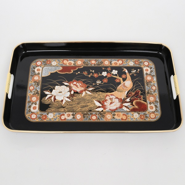 • Bandeja de serviço com formato retangular, confeccionada em material plástico rígido (resina sintética moldada), com decoração de inspiração oriental; laterais com aberturas para pega, revestidas por elemento tubular em material plástico. Superfície interna com campo central decorado por ave de cauda longa em paisagem com flores e ramos, circundado por friso contínuo de motivos florais; composição executada por impressão/transferência com acabamento superficial envernizado. Medidas: