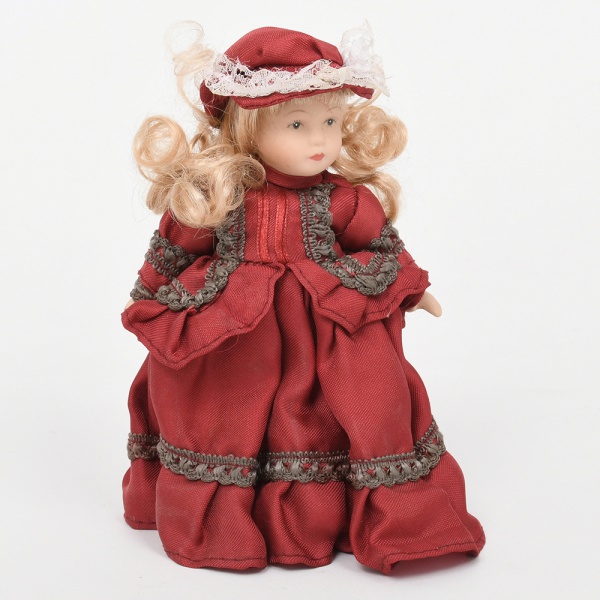 • Boneca de coleção em material sintético com indumentária em tecido, com cabeça e membros em material sintético moldado, feições pintadas, olhos fixos e cabelos em fibra sintética de coloração clara, dispostos em cachos. Corpo estruturado, trajando vestido longo em tecido, de modelagem volumétrica, com pregueado na saia, mangas amplas e aplicação de passamanarias. Acompanhada de touca coordenada com aplicação de renda. Estado de conservação conforme fotografias. Medidas: