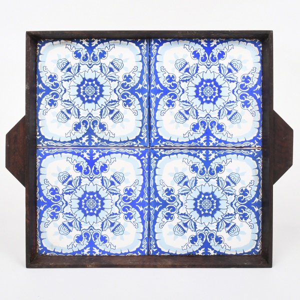 • Bandeja de formato retangular, em madeira, com abas laterais integradas e borda elevada. Fundo composto por quatro azulejos cerâmicos justapostos, decorados em monocromia azul sobre fundo branco, com composição simétrica de caráter vegetalista, centrada em elemento floral estilizado, circundado por volutas e motivos fitomorfos. Medidas: