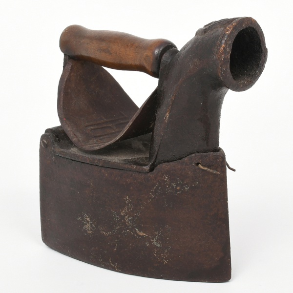 • Ferro de engomar a carvão, confeccionado em ferro fundido, com empunhadura em madeira. Corpo maciço com base plana e reservatório interno para carvão; tampa superior articulada por eixo lateral, com abertura para abastecimento; bocal frontal tubular para ventilação e exaustão de gases; pega superior em madeira torneada fixada por suportes metálicos; elemento central curvo com inscrição em relevo BUGRE. Construção por fundição e montagem com articulações mecânicas. Estado conforme fotografias. Medidas: