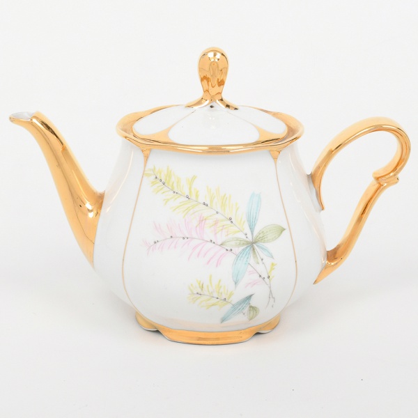 • Porcellana Mauá, Mauá - SP(Fundada em 1937 por Fritz Erwin Schmidt / ativa até 1968). Bule para chá em porcelana nacional da década de 1950/60, esmaltação branca, decorada com composição floral em estampagem policromada, bordas, alça lateral, bico vertedor e puxador integralmente recobertos com douradura. Marca da manufatura ao fundo. Medidas: