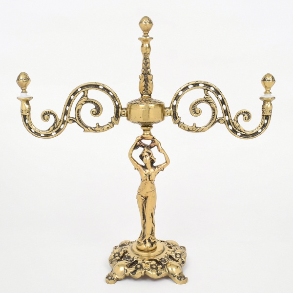 • Candelabro de três luzes em metal dourado e bronze, com base de formato recortado apresentando elementos em relevo, haste central encimada por elemento torneado e remate superior, sustentado por figura feminina em vulto pleno, da qual partem braços laterais em volutas perfuradas, terminando em suportes para velas(faltando bobeches). Medidas: