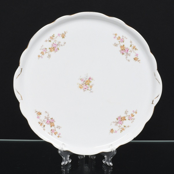 • Porcelana Renner, Porto Alegre - RS(Fundada em 1937). Bandeja circular em porcelana nacional, esmaltação branca, aba larga e borda recortada em contorno ondulado. Decoração por decalque com motivos florais distribuídos na aba e no centro, em policromia (tons de rosa, amarelo e verde), realçado com filete dourado aplicado na borda. Marca da manufatura no verso. Medidas: Diam.