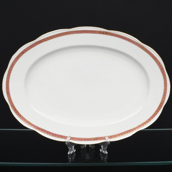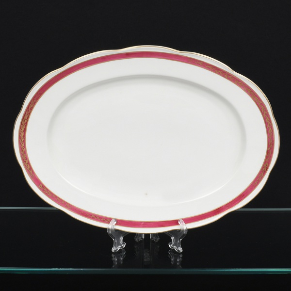 • KPM - Krister Porzellan-Manufaktur, Waldenburg - Alemanha(Fundada em 1831 por Karl Kristen). Travessa oval em porcelana polonesa, esmaltação branca, com aba levemente ondulada. Decoração em faixa contínua junto à borda, composta por fundo em tom magenta com motivo de folhagem estilizada em douração, delimitada por filetes dourados. Marca de manufatura no verso. Medida: Comp.: x Larg.: cm.
