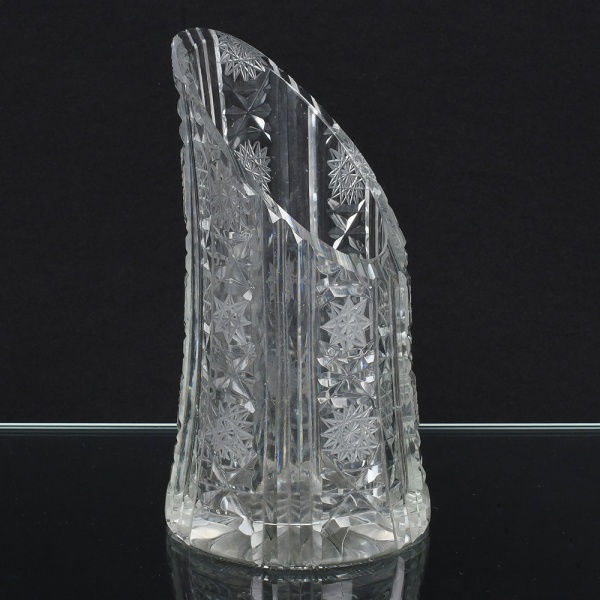• Vaso executado em cristal lapidado, de corpo alto e assimétrico, com borda superior em corte oblíquo. Decoração executada por lapidação profunda, composta por painéis verticais alternando caneluras e reservas com motivos geométricos, incluindo rosetas radiais, estrelas multifacetadas e elementos prismáticos dispostos em repetição. Base circular espessa, com lapidação inferior em desenho radial. Medidas: